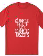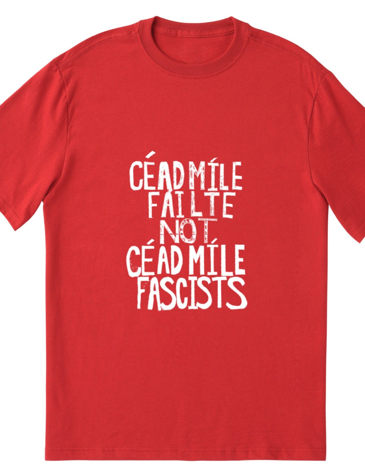 Red t-shirt with "CÉAD MÍLE FAILTE NOT CÉAD MÍLE FASCISTS" written on the front